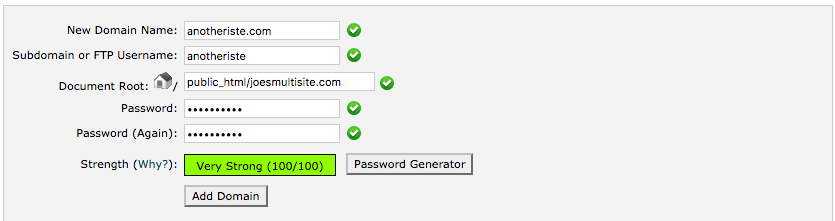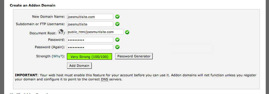 One by one, it’s time to add each domain as an Addon Domain in SiteGround’s cPanel. Do that just as we did above, with one incredibly important difference. Make sure the directory matches the directory of your main domain. In this case, it would be public_html/joesmultisite.com. The way the domain mapping plugin works, it routes all domains through the main one, so every top-level domain in the Multisite Install needs to be pointing to a single directory.