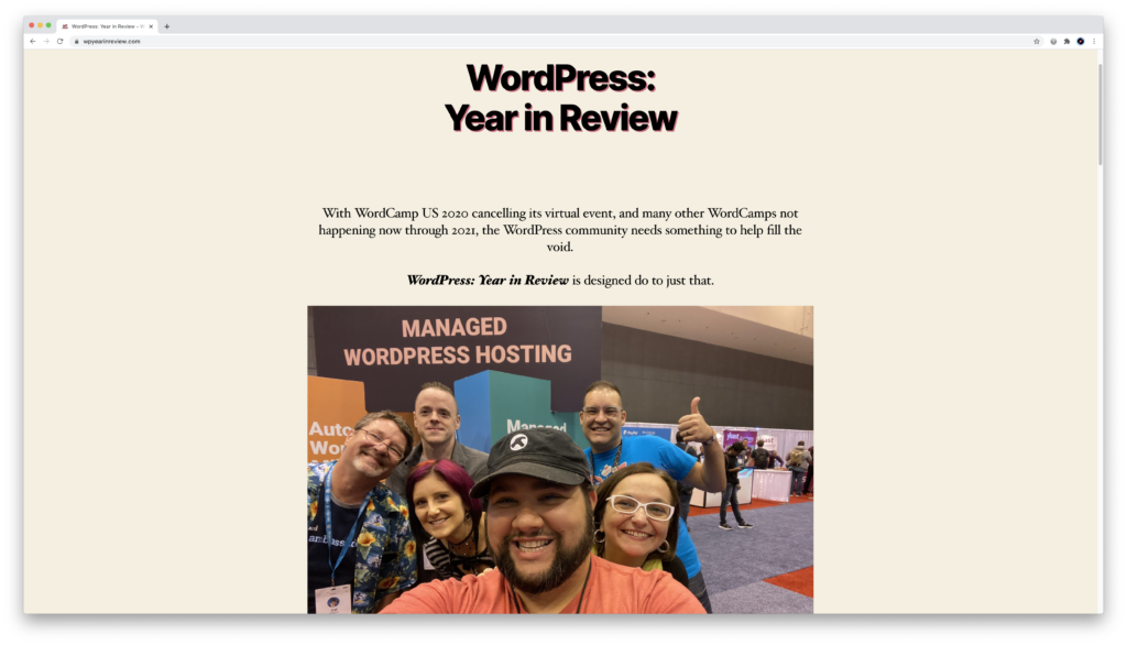 Earlier this month I launched WordPress: Year in Review, a content project where I’m wrapping up everything that happened with WordPress and in the community this year through an eBook, podcast, and video series. It’s an immense undertaking, so I decided to seek community support through sponsors and crowdfunding. We’re 3 weeks into September and I’m nearly 2/3 of the way to my crowdfunding goal which is exciting! I thought I’d take some time here and explain how I built the site.