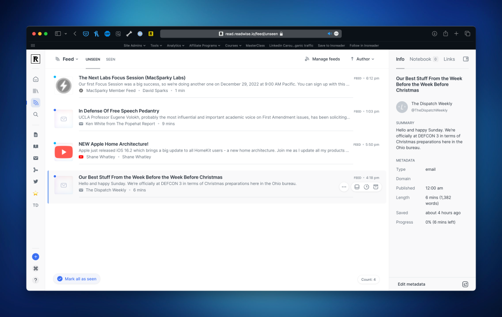 To call Reader an RSS service would be a gross understatement though. It’s a library for everything you read: RSS, PDFs, Emails, Tweets, and even ebooks (though definitely still prefer my Kindle Scribe for that).