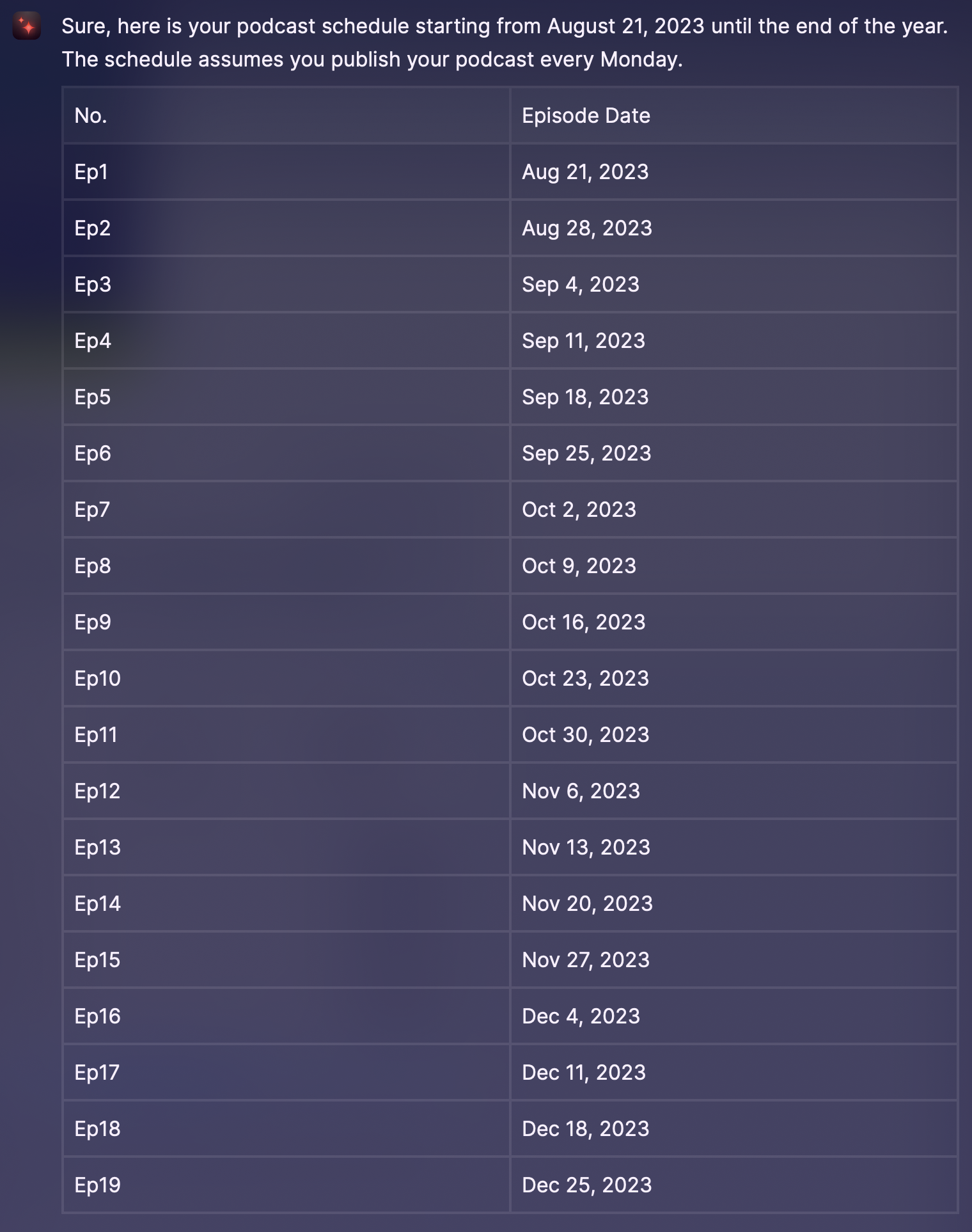I'd like to publish a weekly podcast starting on Monday Aug. 21, 2023. Please create a schedule with episodes from that date until the end of the year.
