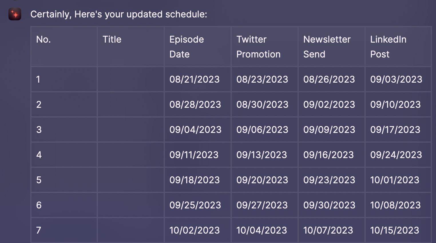Next, I had it use that schedule to create a schedule of dates for Twitter, Newsletter, and LinkedIn Posts: