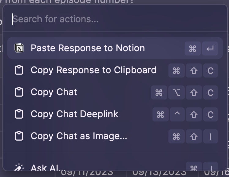 Now there’s a little magic here because Raycast / Chat GPT generated these results using a Markdown table. So I open a new page in the Notion app, go back to Raycast and press Cmd+K.