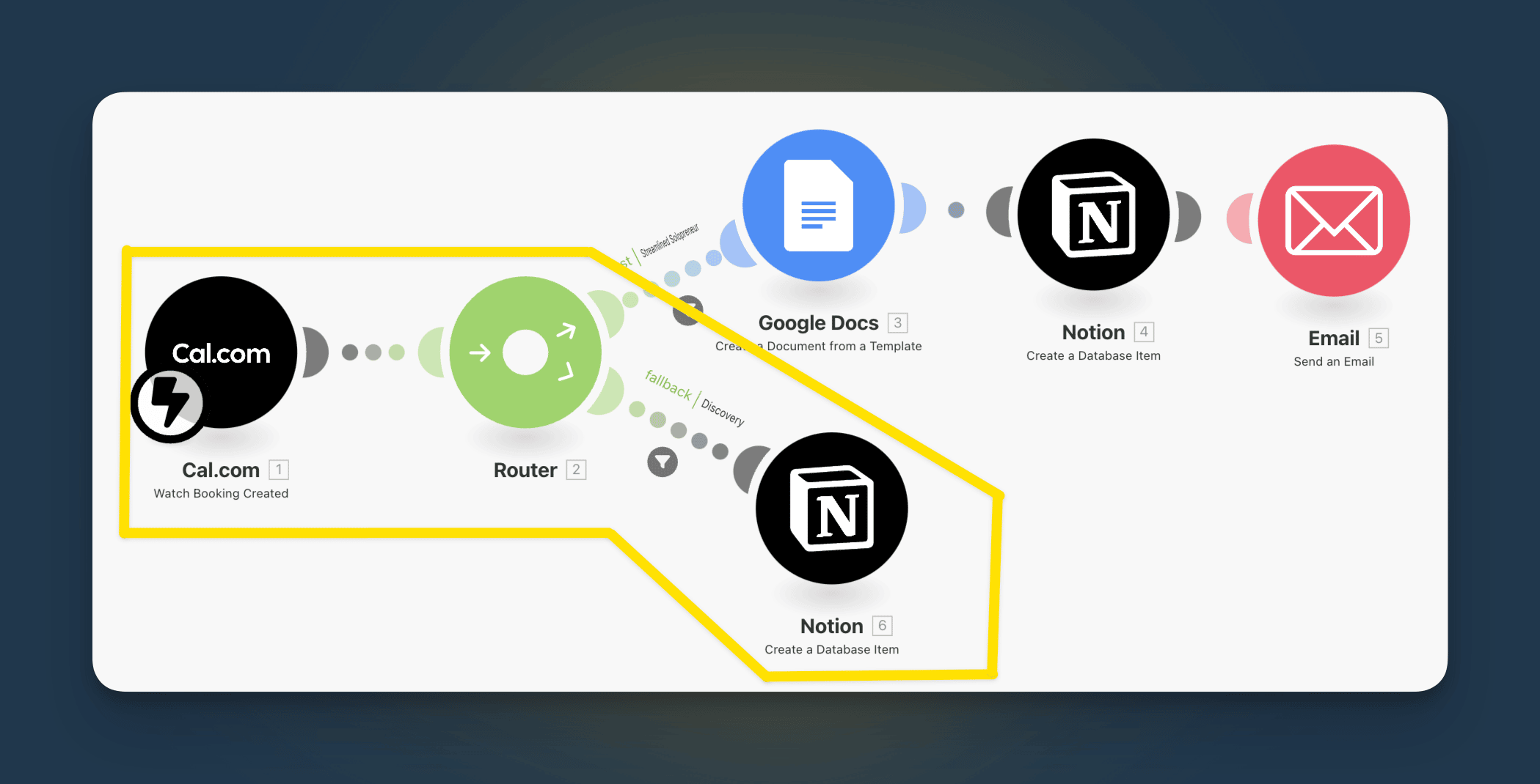 I call it my “Scheduling Router.” Different actions are triggered depending on the event name—including a complete workflow for my podcast guest bookings. The branch of interest here, though, is for the “Discovery Call” event.