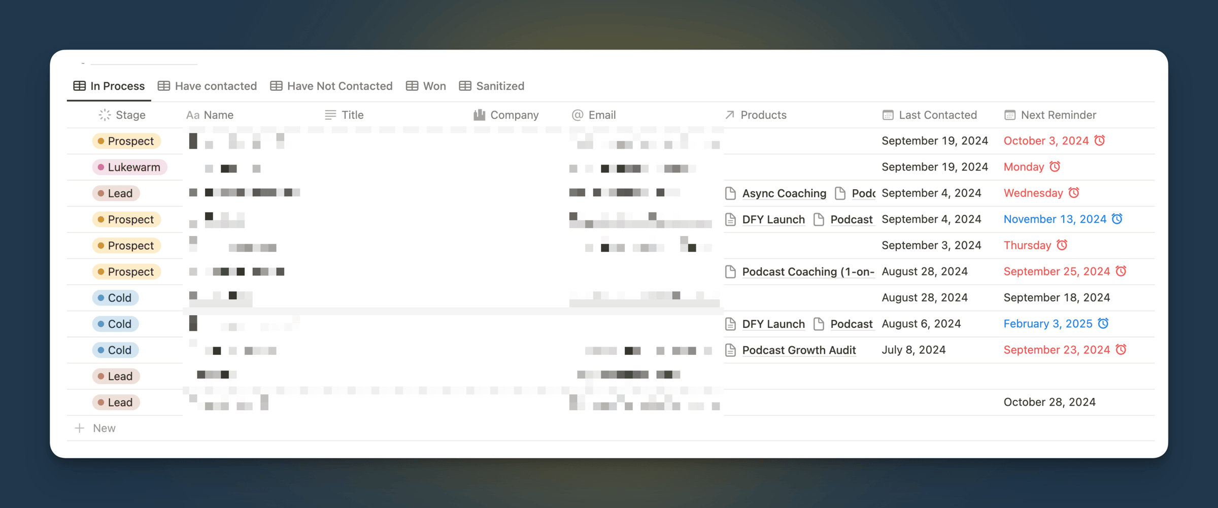In Notion, I have a CRM database that looks something like this: