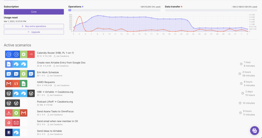 Luckily, I was able to dial them back a reasonable amount and now I’m well within the limits of 10,000 operations per month, giving me wiggle room to add even more scenarios. And for what it’s worth, Zapier has this baked into their much higher cost.