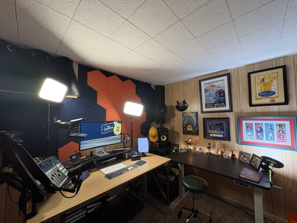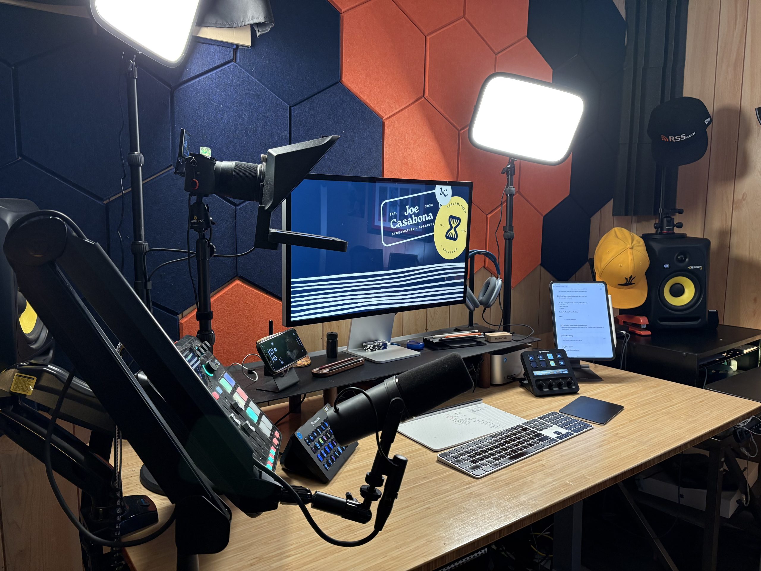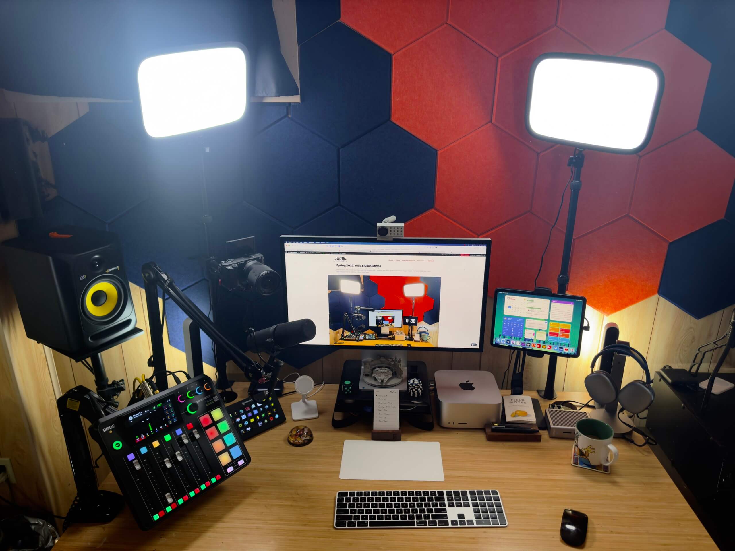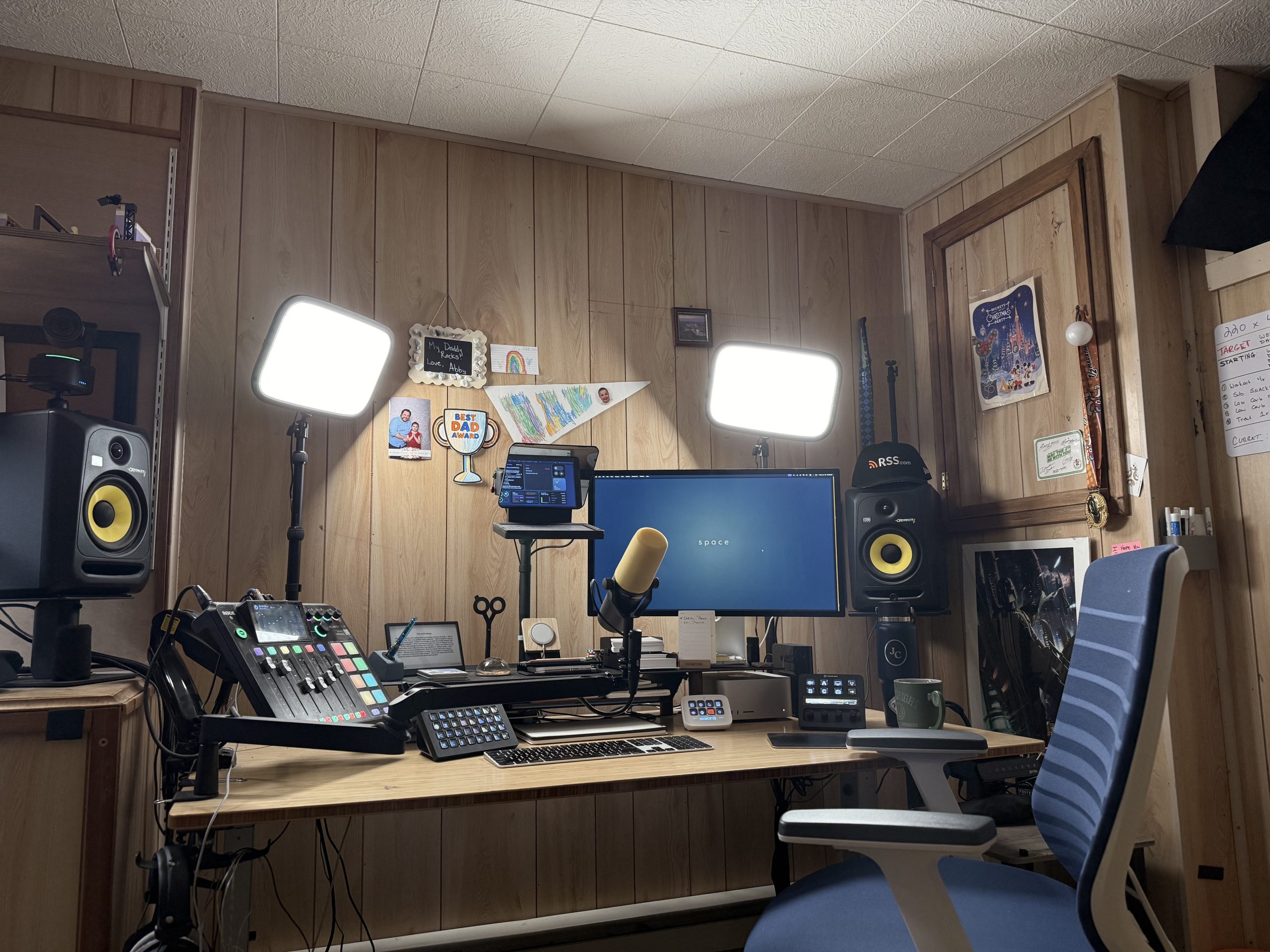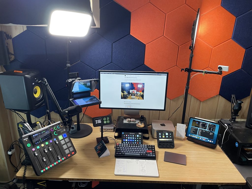 Elgato Key Lights : Now that I’ve moved my desk, I get perfectly even lighting with my Main and fill light. This is SO much better than the previous setup. My Air and Neo are off to the side, providing addition lighting in certain situations.- Rodecaster Pro 2: My interface and Mixer. It’s mounted on a standard VESA arm to keep it off my desk. I highly recommend it if you’re a podcaster!