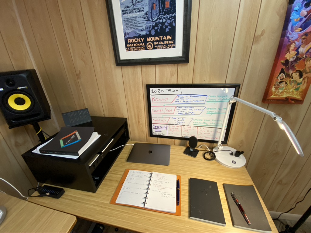 My writing desk is for focused work like writing, journaling, and planning. SO much so that I’ve moved most of the tech aside so it’s a nice, big writing space. The desk is a Flexispot E7*. I love it.